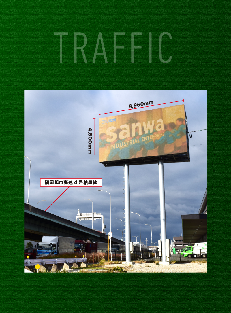 福岡で唯一、都市高速から見える大型ビジョンです。 交通量 約424万台(都市高速+国道201号線)、約9m×5mの2画面で放映致します。